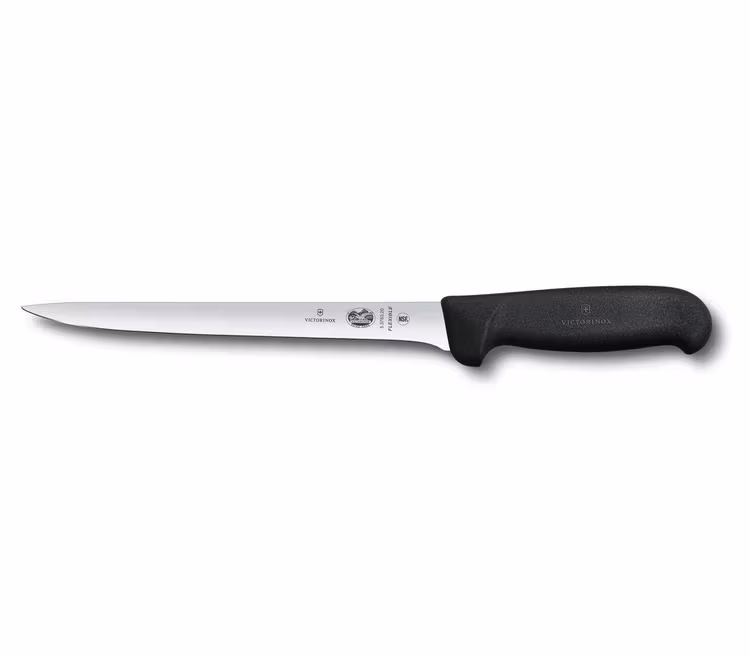 En filékniv med 20 cm långt flexibelt blad från Victorinox med ett ergonomiskt och halkfritt Fibroxskaft.